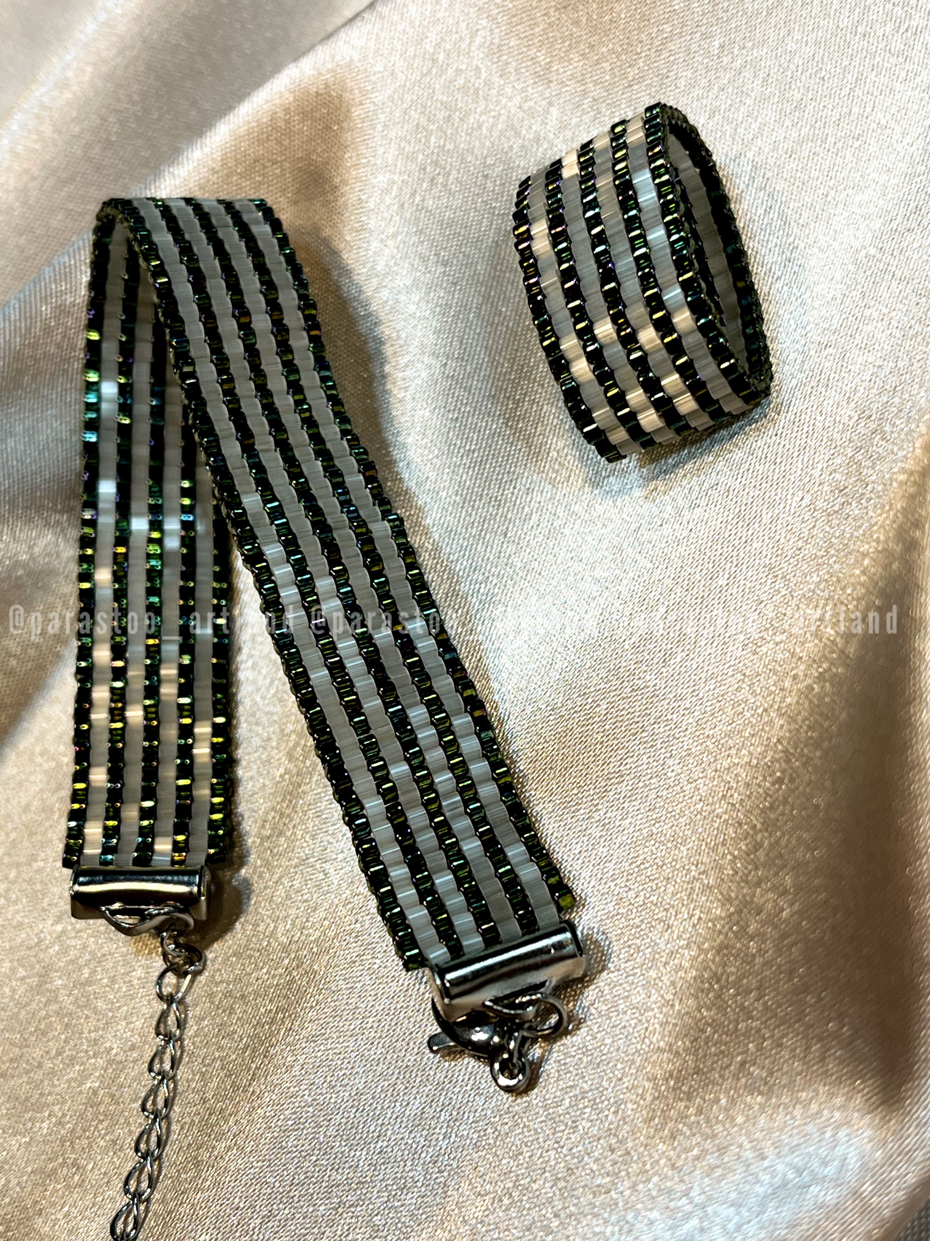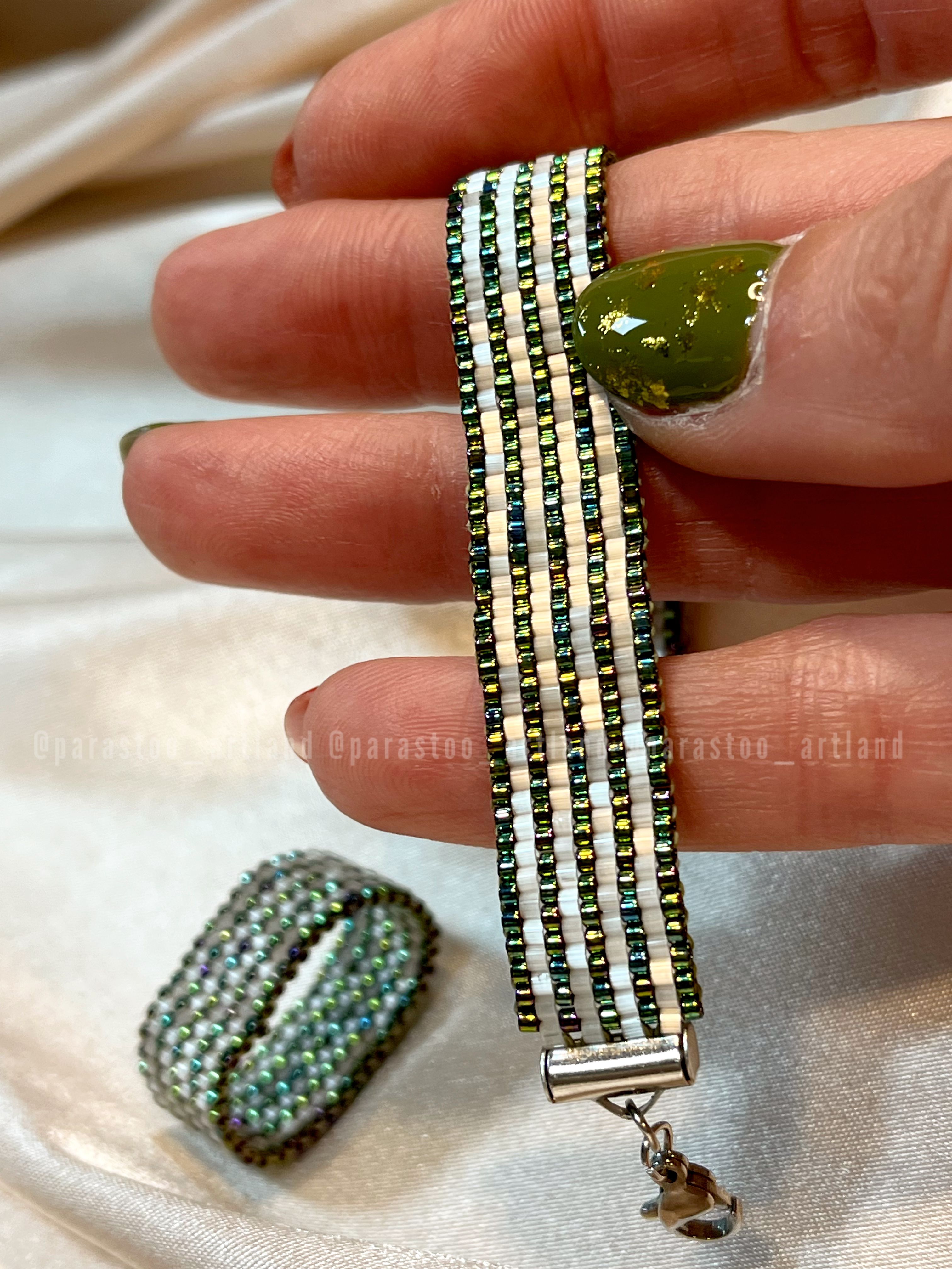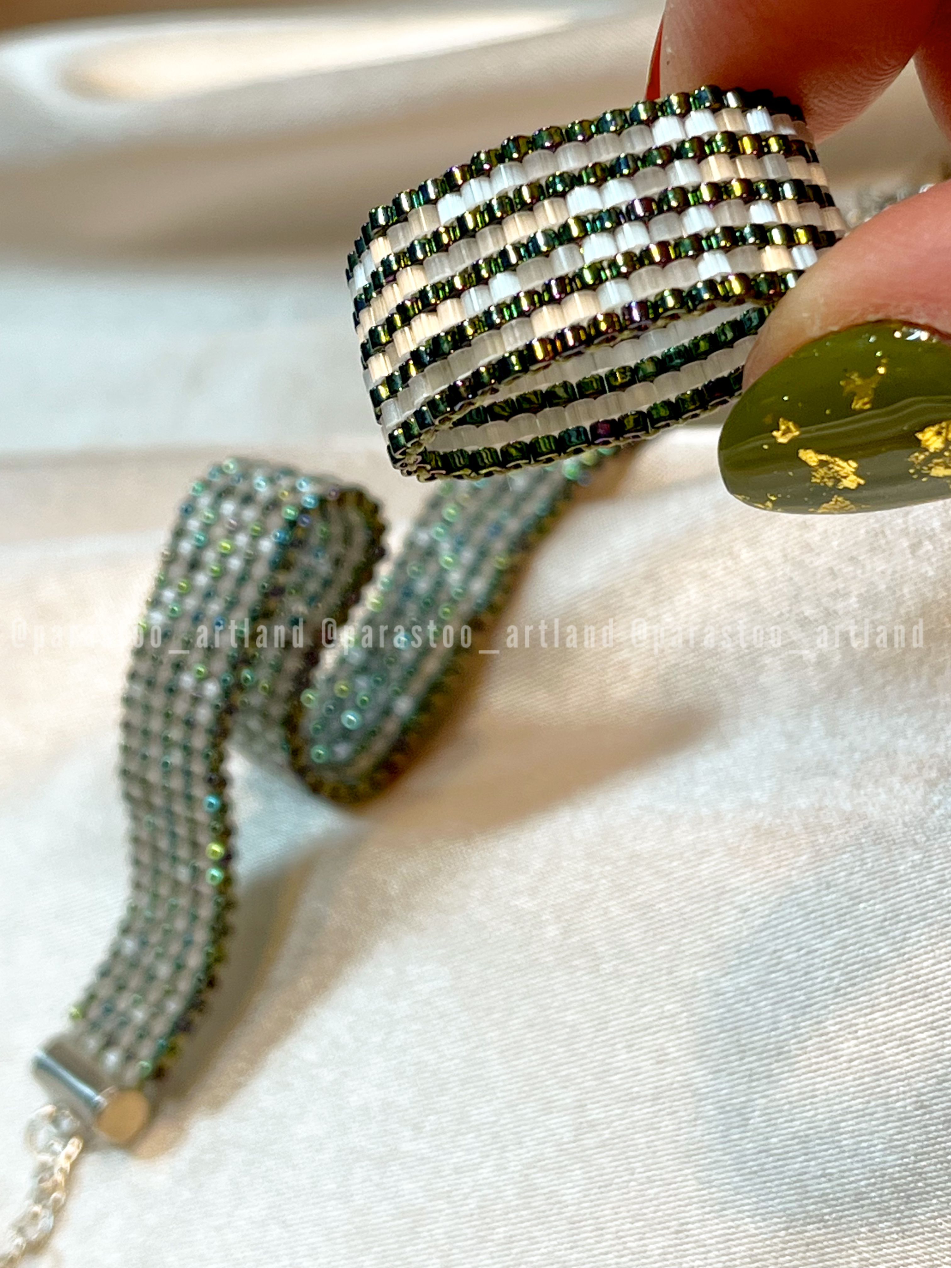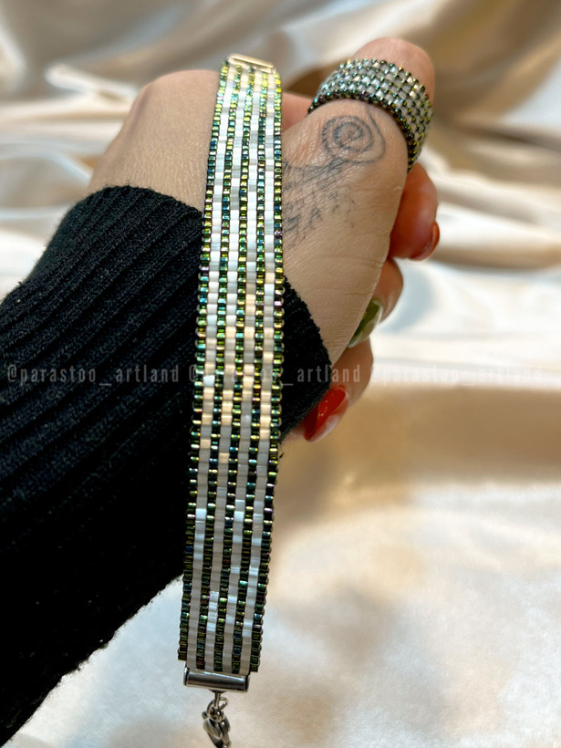 تمام متریال و منجوقهای استفاده شده در کارها از محصولات میوکی ژاپن هستند که کیفیتی درجه یک دارند و با نمونه های منجوقهای ایرانی،چک یا چینی هم از نظر یک دست بودن سایز منجوقها و هم از نظر ثبات رنگ اصلا قابل مقایسه نیستند و حتی کیفیتی خیلی بالاتر از نمونه ی کپی شده ی این محصول به نام fgb دارند