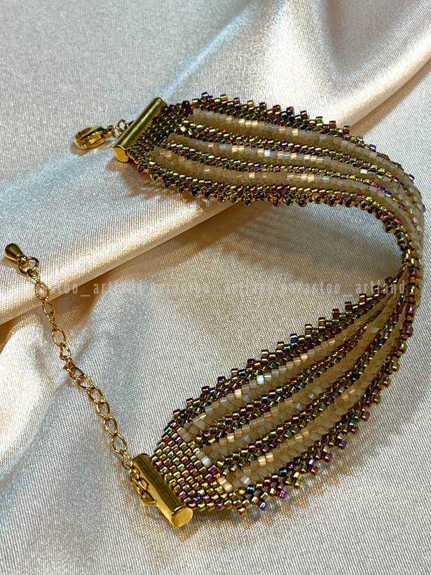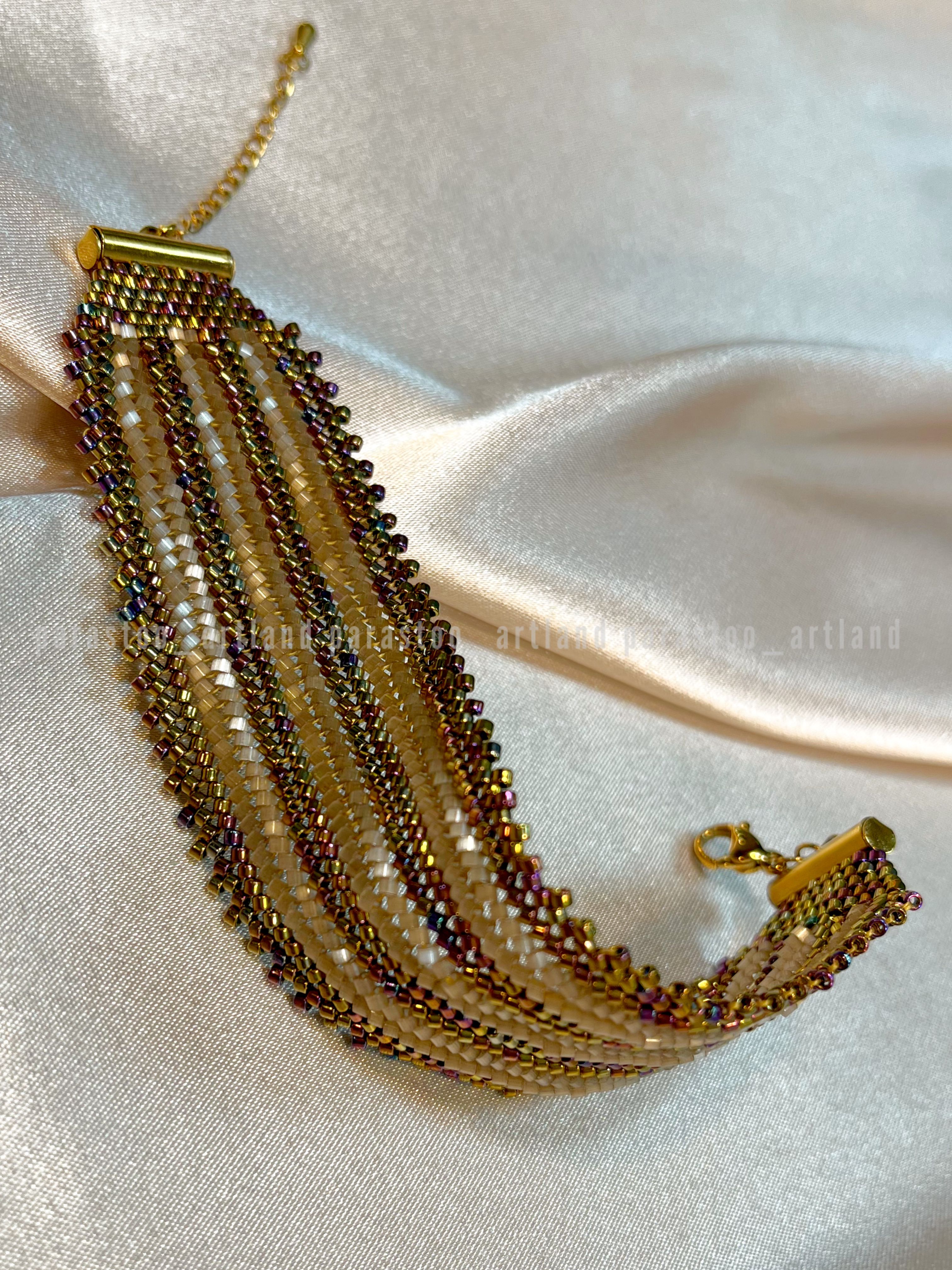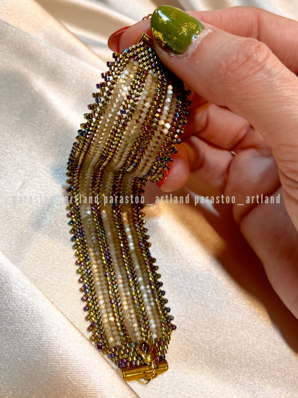 تمام متریال و منجوقهای استفاده شده در کارها از محصولات میوکی ژاپن هستند که کیفیتی درجه یک دارند و با نمونه های منجوقهای ایرانی-چک یا چینی هم از نظر یک دست بودن سایز منجوقها و هم از نظر ثبات رنگ اصلا قابل مقایسه نیستند و حتی کیفیتی خیلی بالاتر از نمونه ی کپی شده ی این محصول به نام FGBدارند