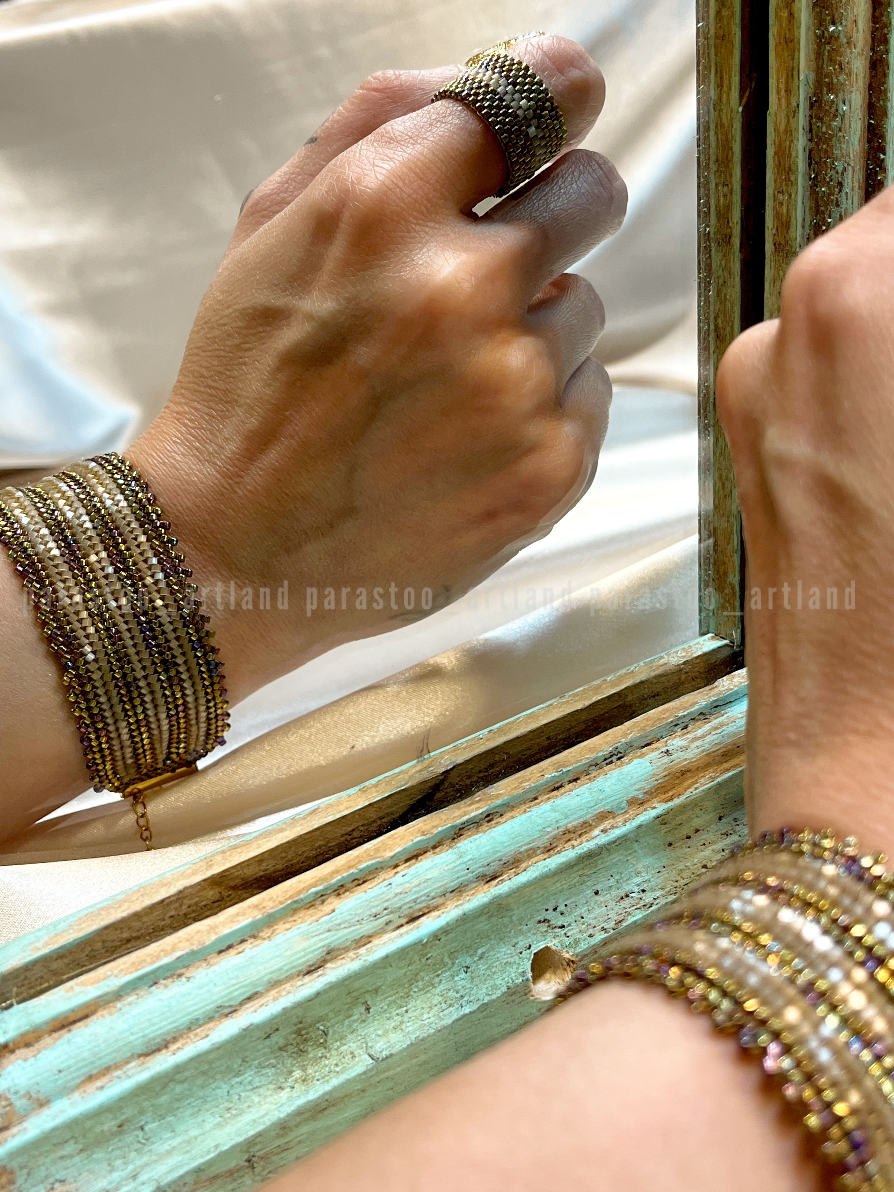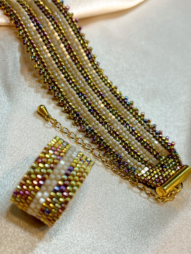 تمام متریال و منجوقهای استفاده شده در کارها از محصولات میوکی ژاپن هستند که کیفیتی درجه یک دارند و با نمونه های منجوقهای ایرانی،چک یا چینی هم از نظر یک دست بودن سایز منجوقها و هم از نظر ثبات رنگ اصلا قابل مقایسه نیستند و حتی کیفیتی خیلی بالاتر از نمونه ی کپی شده ی این محصول به نام fgb دارند